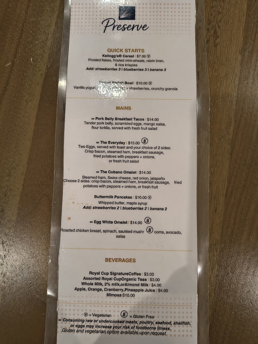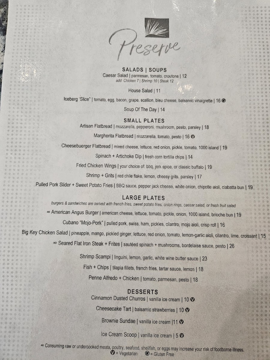 The Preserve Bar and Grill Menu offers a delightful variety of dishes, making it a perfect spot for any meal of the day. For breakfast or brunch, the menu features comforting choices like the Kellogg’s® Cereal, Yogurt Parfait Bowl, and hearty options like the Buttermilk Pancakes and Egg White Omelet. If you’re craving something savory, the Cubano Omelet brings a flavorful twist with Cuban-inspired ingredients. Whether you're in the mood for a light bite or something more substantial, the Quick Starts and Mains sections provide plenty of options to kick off your meal.
